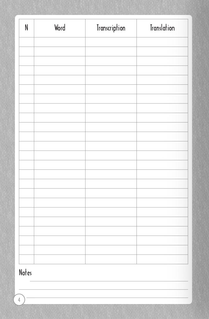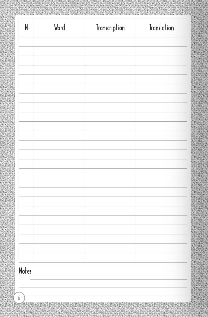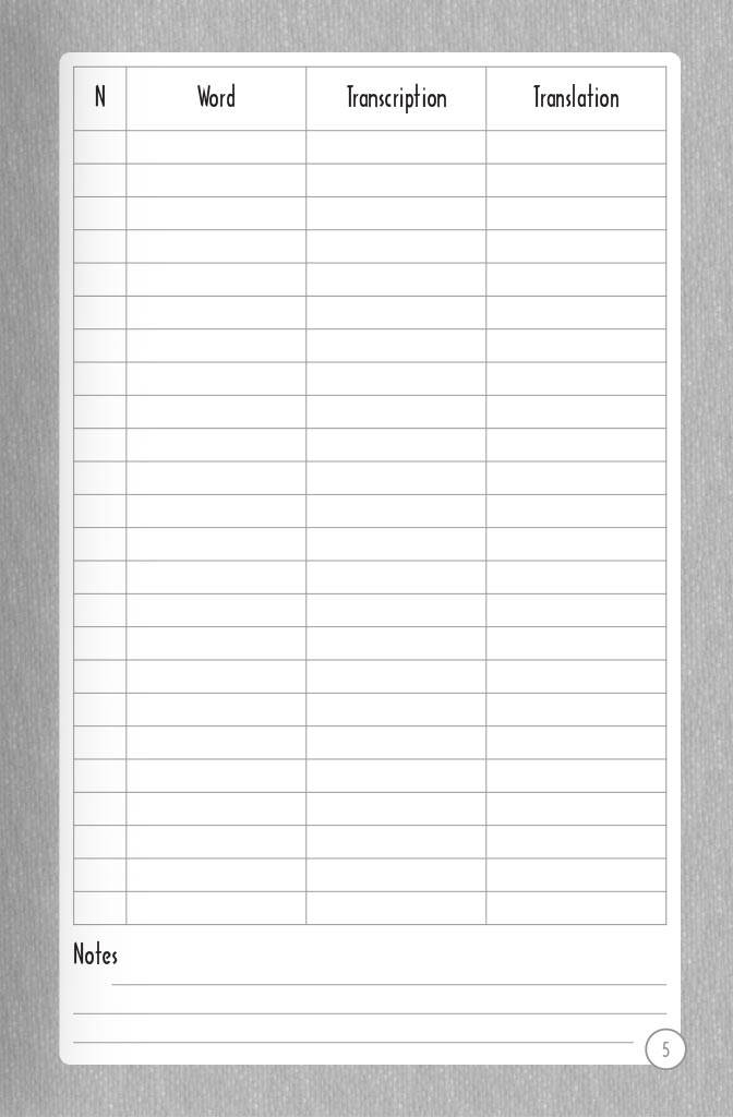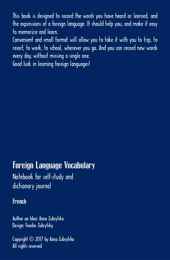 This book (108 pages) is designed to record the words you have heard or learned, and the expressions of a foreign language. It should help you, and make it easy to memorize and learn. Convenient and small format will allow you to take it with you to trip, to resort, to work, to school, wherever you go. And you can record new words every day, without missing a single one. Good luck in learning foreign languages!