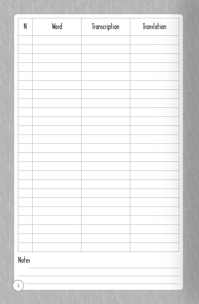 This book (108 pages) is designed to record the words you have heard or learned, and the expressions of a foreign language. It should help you, and make it easy to memorize and learn. Convenient and small format will allow you to take it with you to trip, to resort, to work, to school, wherever you go. And you can record new words every day, without missing a single one. Good luck in learning foreign languages!