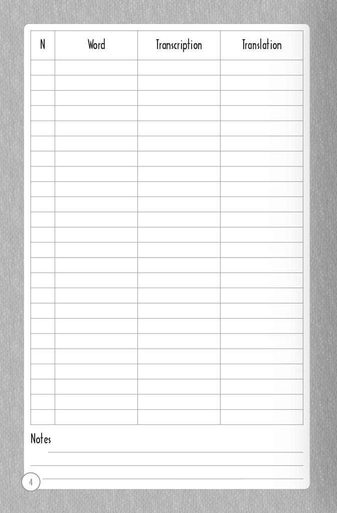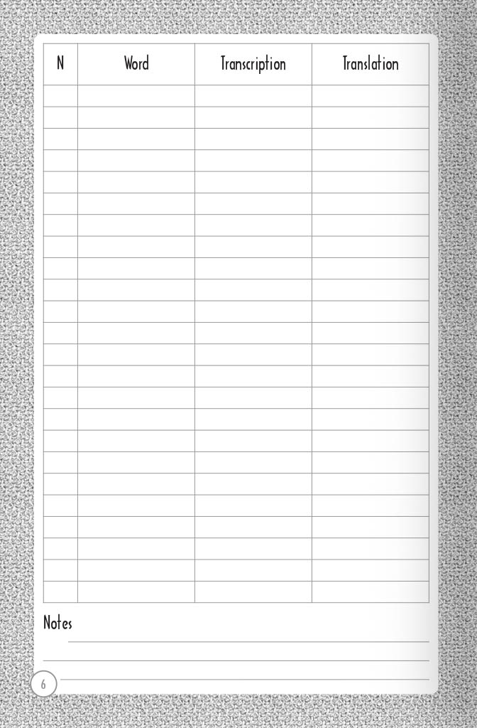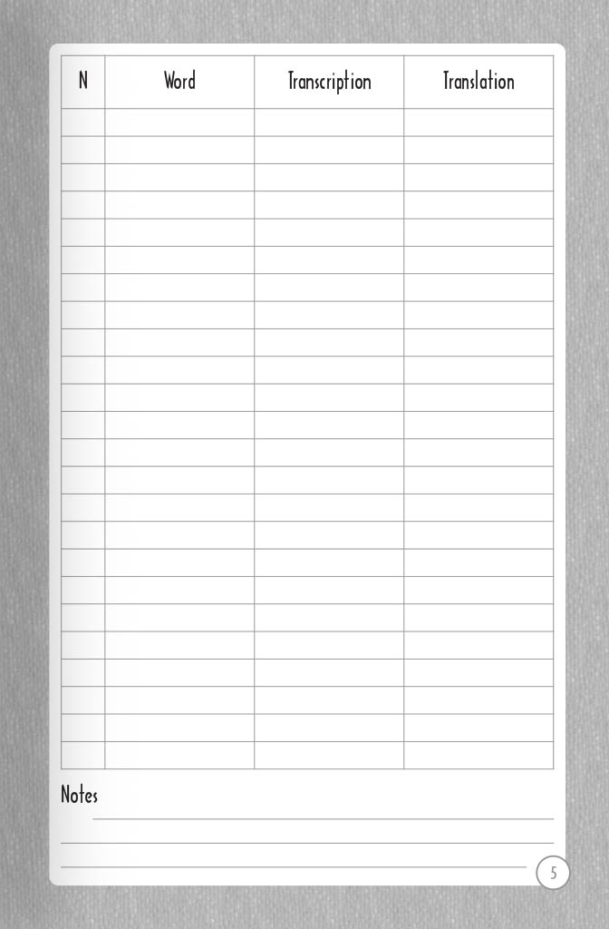 This book (108 pages) is designed to record the words you have heard or learned, and the expressions of a foreign language. It should help you, and make it easy to memorize and learn. Convenient and small format will allow you to take it with you to trip, to resort, to work, to school, wherever you go. And you can record new words every day, without missing a single one. Good luck in learning foreign languages!