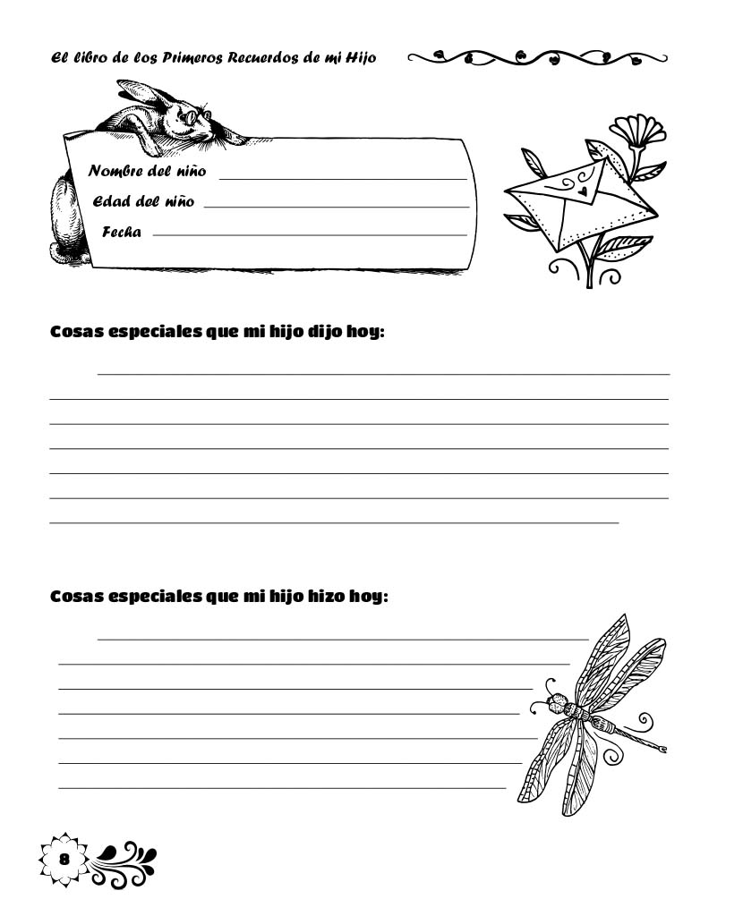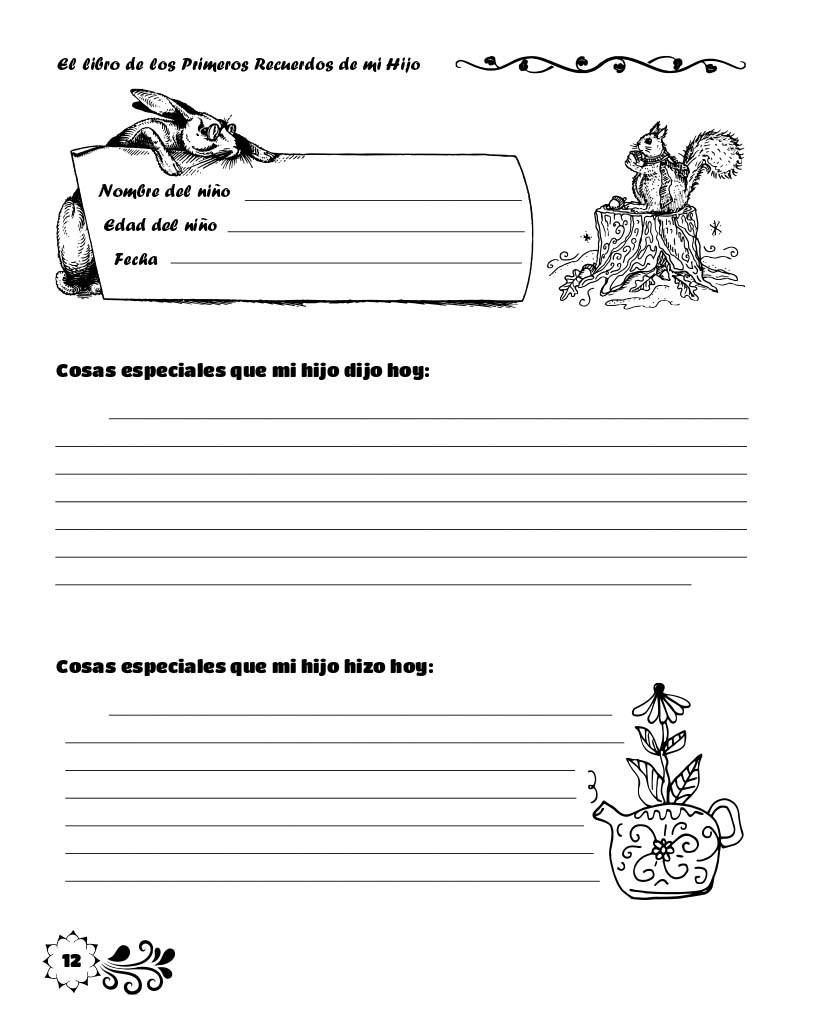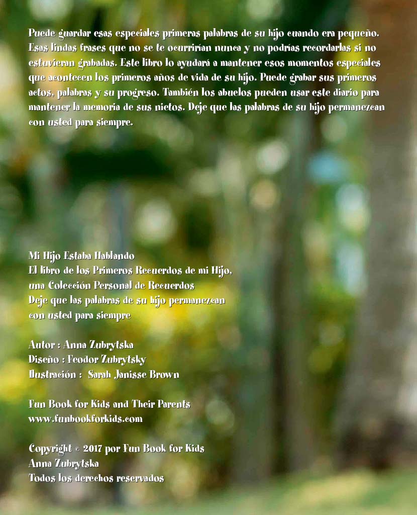 Puede guardar esas especiales primeras palabras de su hijo cuando era pequeño. Esas lindas frases que no se te ocurrirían nunca y no podrías recordarlas si no estuvieran grabadas. Este libro lo ayudará a mantener esos momentos especiales que acontecen los primeros años de vida de su hijo. Puede grabar sus primeros actos, palabras y su progreso. También los abuelos pueden usar este diario para mantener la memoria de sus nietos. Deje que las palabras de su hijo permanezcan con usted para siempre.
